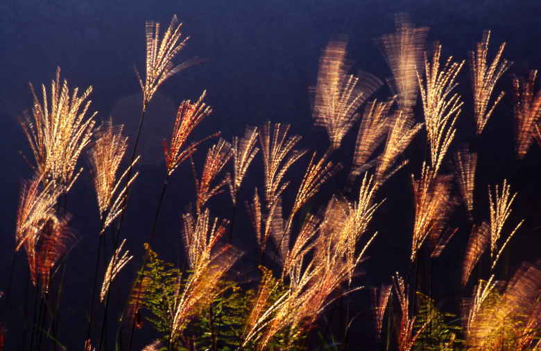 秋。すすきの様々な表情をとらえました。流れる雲。風。夕日。雨。霧。